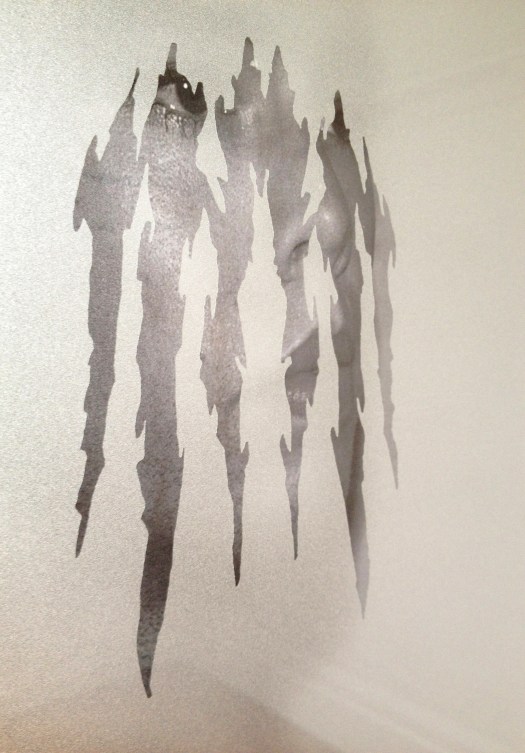 Masked, Xerox print, laser cut frosted adhesive vinyl on glass, 340mm x 500mm, 2014.